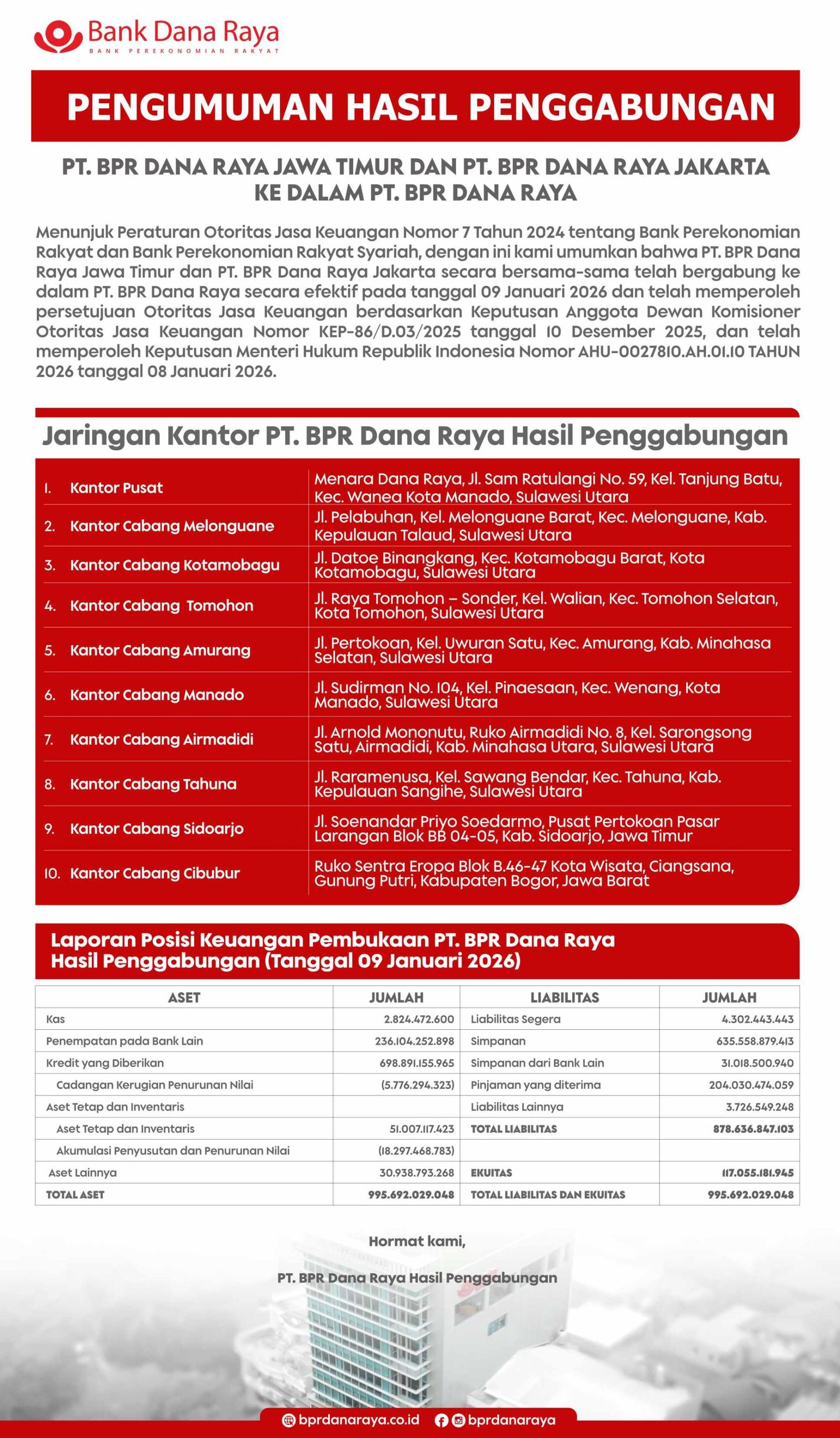 Dengan adanya penggabungan PT. BPR Dana Raya Jawa Timur dan PT. BPR Dana Raya Jakarta ke dalam PT. BPR Dana Raya, maka status Kantor Pusat PT. BPR Dana Raya Jawa Timur menjadi Kantor Cabang Sidoarjo dan Kantor Pusat PT. BPR Dana Raya Jakarta menjadi Kantor Cabang Cibubur.